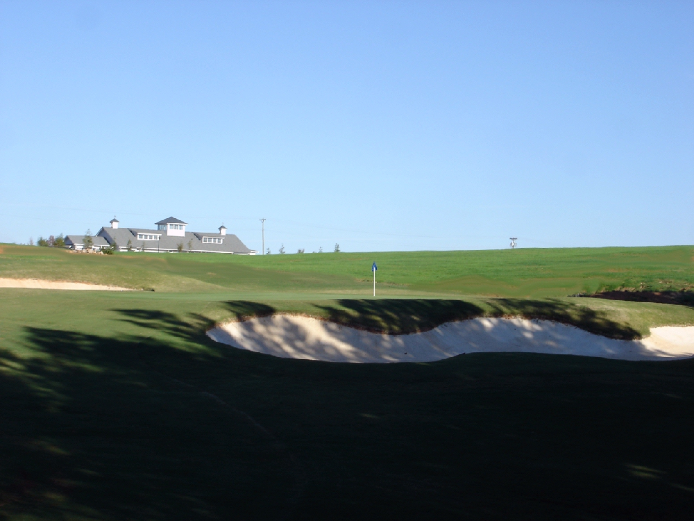 | Edgewater Golf Club Hole 18 Par 4 Approach view to the multi-trapped green. It is recomended that you choose an extera club length for this uphill shot. |