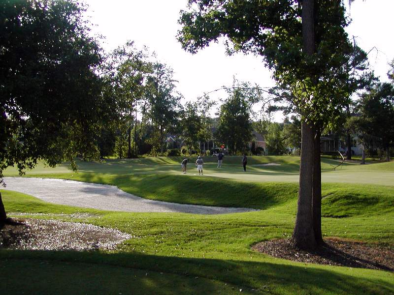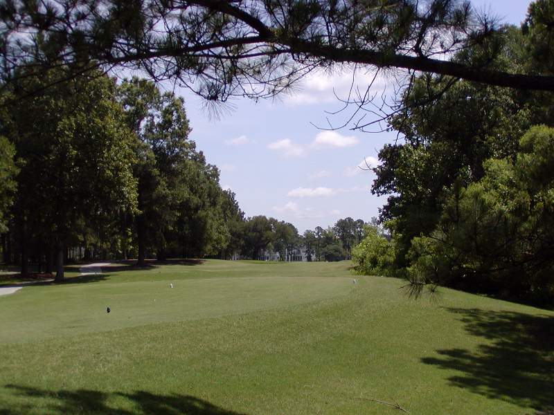 Hole number five is a straight-away par 5 that can be reached in two by long hitters. However the green is well protected and not quite as large as most greens in Legend Oaks. For this reason pin placement can seriously effect strategy of the third shot, usually a wedge. Sometimes a wise choice is to just aim for the fat of the green and just get on. |