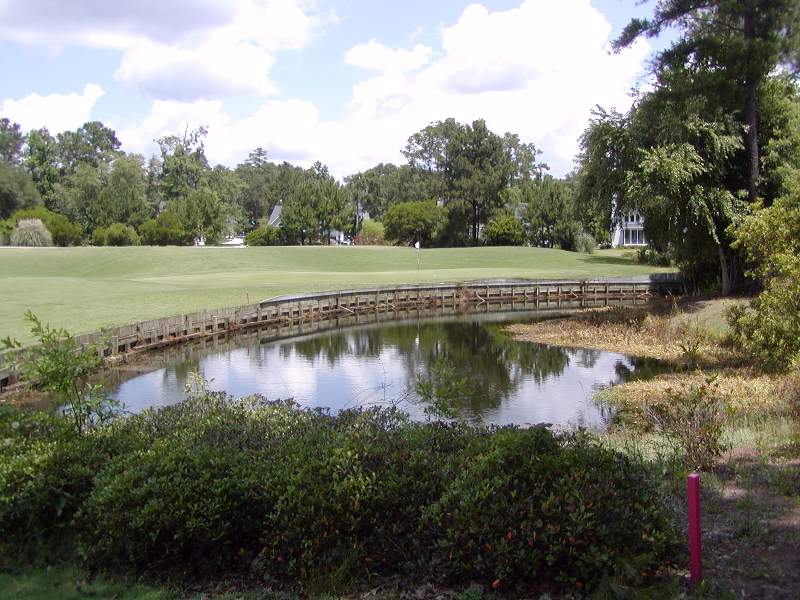 This par five favors a drive to right center in order to avoid the water on the left. This water extends far enough to collect any drive to the left. The green can be reached in two by long hitters. It is guarded by water on the right with bulkhead. |