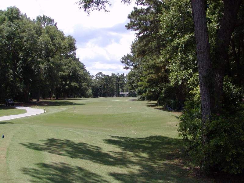 The 9th is a dogleg right but a straight drive is sufficient to allow a short iron approach to the green. There is a large bunker on the left of the green and will catch anything in that direction. |