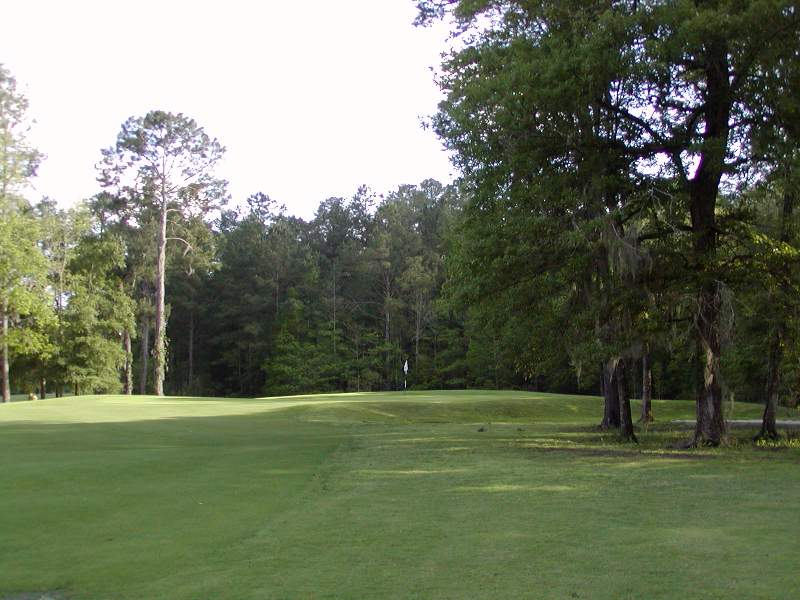 The water in front of the tee and to the left should never come into play. This is a dogleg left and a correct distance off the tee is important. The drive must be long enough to get past the bend but not too long to go through the fairway. |